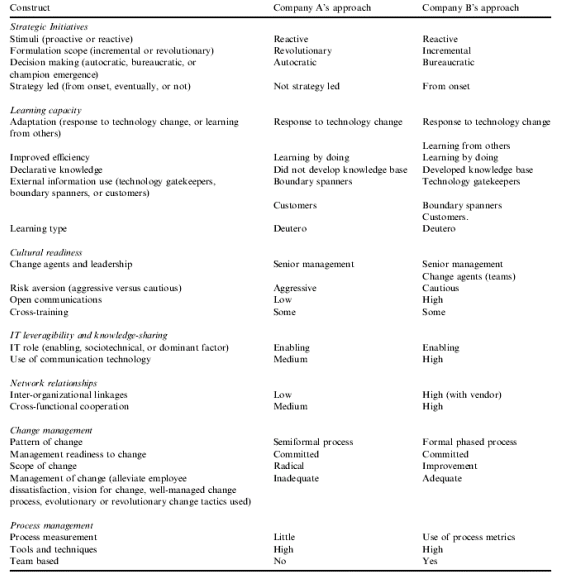 兩個公司都有建立一個可以學習的環境的想法,這種環境能對技術變革作出適當響應,或者能從行業中取得豐富經驗的公司那里學習。然而A公司意識到其它公司的ERP系統的缺陷,這些公司以為他們能在ERP咨詢商,一些培訓和生活系統那里得到幫助而輕松的適應新技術。但是他們真的低估了新技術的復雜性。一個最終使用者評論說: