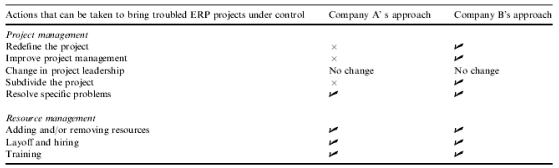 八個方面的措施被按照是項目管理或者是資源管理分類,它們能潛在的將受阻的ERP項目得到控制。這些措施源自軟件項目擴容理論[8]。項目管理類的措施包括五點。它們是:項目重定義,項目管理改良,項目領導變革,將項目細分成易管理的部分,以及解決明確的問題。項目重定義包括減小項目規模,財務方面重新調整,以及著眼于最重要的特性和交付性。項目管理改良包括更有規律的接觸和復習,系統模塊更精確的交付時間表,以及其它一些更緊密地控制項目的方法。項目領導變革包括與項目擴容有關聯的領導的替換,新領導可以來自公司內部,也可以來自外部。許多情況下,這個方法替換了項目經理,在一些實例中,項目經理的權利移交給了一個外部的顧問。將項目細分成易管理部分包括確定一個大項目分成的幾個可以獨立工作的小項目。軟件管理類的最后一個是解決明確的問題。大多數情況下,這樣的問題包括外部關系或者是技術問題。外部的問題包括軟件許可發布或者軟件供應商的其他問題。技術難題包括軟件或者硬件問題的解決方案,經常和移植到新的軟硬件架構上所遇到的問題。