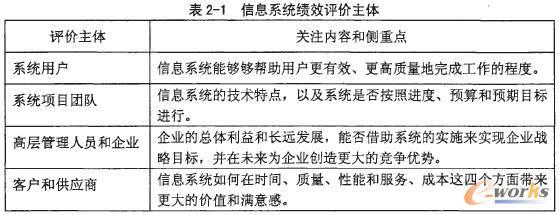 評價主體是指接受委托施予評價的組織、個人或工作組。信息系統績效評價的主體可以劃分為兩類:外部實體和內部實體。外部實體主要包括政府或者是受委托的第三方,以及客戶和供應商等。內部實體主要指企業自身的某個部門。但是由于評價目的和所處地位與角度不同,其關心的內容和側重點就有所不同,如表所2.1所示: