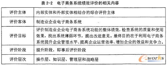 制造業企業電子商務系統績效評價的評價主體、評價客體、評價目標、評價階段和評價層次的具體內容如表2.2所示:
