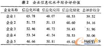我們以東莞市被調(diào)查的部分中小型制造企業(yè)2006年各項(xiàng)指標(biāo)為樣本,使用上述評價方法計算各企業(yè)的信息化水平綜合評價值,排名前5的企業(yè)得分情況如表2所示。