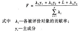 主成分分析的實質是用少數幾個不相關的指標來代替原來為數較多的、彼此有一定關系的指標,然而這幾個少數的指標能夠盡可能多地反映原來的信息量。其可取之處在于通過一定的數學變換來實現定性指標的定量化,同時避免了信息重復,且權數是在指標合成過程中自動生成的,避免了人為確定權數時主觀因素的影響。在主成分分析的綜合評價上,目前我國學者的通常做法是既重視第一主成分,也顧及其他主成分所起的作用。在郝曉玲和孫強所編著的《信息化績效評價框架、實施與案例分析》一書中提出了一種改進方法,即先按累計方差貢獻率不低于闕值的原則確定前k個主成分,然后以選擇的每個主成分各自的方差貢獻率為權數,將它們線型加權求和得綜合評價值指標F。綜合評價值F的計算公式為