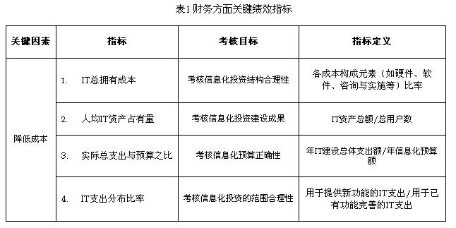 在財務方面對信息化運營進行控制,主要目的在于促進投資建設的合理化,同時降低IT服務的成本。具體可以細化為以下指標,如表1所示。