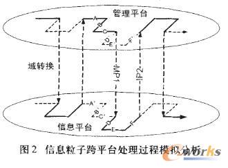 按照域映射理論和信息化平臺匹配理論,信息流在信息平臺的處理過程是對其在管理平臺運行過程的“快照和模擬”。企業(yè)信息化初期,要經(jīng)歷手工替代的漫長過程,管理域中的一個完整流程被劃分成隸屬于管理域和信息域的兩個子集,由多個流程碎片組成,處理主體分別為人和信息系統(tǒng)。流程分割造成信息流跨越兩個域,信息粒子要在管理域和信息域之間遷移。如圖2所示。經(jīng)過 手 工 替代,管理流程被劃分在兩個域且需要串聯(lián)運行,必然形成信息粒子由管理域向信息域、信息域向管理域的多次往復(fù),信息粒子穿越和形式轉(zhuǎn)換形成了信息導(dǎo)人和導(dǎo)出工作:手工方式處理完成的信息要手工導(dǎo)入信息系統(tǒng),滿足下一個階段IT/IS處理的要求;而IT/IS處理完成后生成的信息則以特定的格式打印輸出,供人工處理。信息導(dǎo)入和導(dǎo)出需要大量人工,耗時費力,有時執(zhí)行一個完整工作流程,需要多次導(dǎo)入和導(dǎo)出相同或相似的信息內(nèi)容,造成資源浪費和效率降低。企業(yè)信息化初期,管理效率不升反降即由此造成。