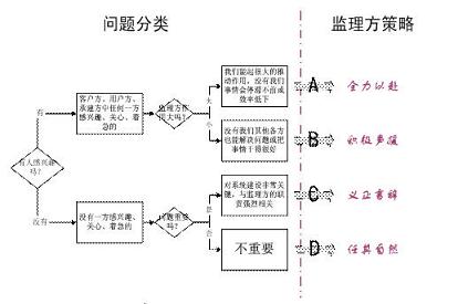根據上圖,很顯然,A類問題最有可能體現監理方價值。這類問題往往涉及到多方關系協調,因為只涉及到一方的問題大多可以通過該方的內部工作解決。如果問題涉及到多方,只能靠協調解決。這種時候最常見的消極情況是互不配合、只關注和自己有關的環節,扯皮、推卸責任。此時監理的一項重要作用得以發揮,即組織協調。例如,在我們監理的某個投資巨大的電子政務項目中出現了一個問題。 由于相關的業務流程復雜,環節多,涉及到的單位多,協調困難,誰都不認為自己有問題,甚至出了問題都不知道該向誰反應,結果導致系統的最終服務對象-老百姓的利益受損。僵持了一段時間后,監理方意識到了問題的嚴重性。經過大量調研,發現在流程中若干環節相對問題集中,而且這幾個環節都由一個單位(甲)負責,于是提出問題解決方案,包括詳細的處理流程。