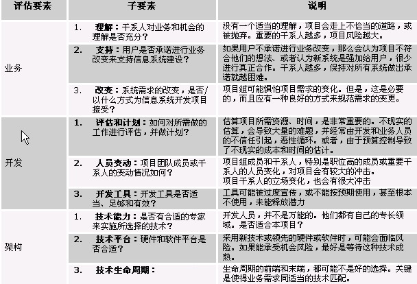 具體IT項目的評估,包括開發實施過程中、實施上線后,對該項目進行的全面評估。這種評估可以從業務、開發、技術三方面進行。比如,在某軟件開發項目過程中,從下面的一些方面進行項目評估。如表1所示。