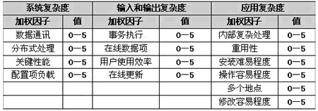 (3)按系統復雜度、輸入和輸出復雜度、應用復雜度3個級別共14項,對軟件進行復雜度加權因子的判斷及取值。影響因子表如表3所示。