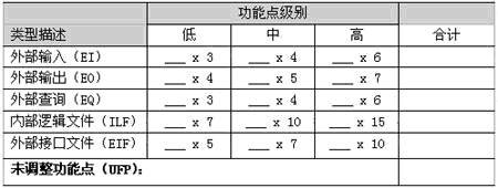 第二步,對分解出的每個工作包進行軟件規模估算。目前,國際軟件工程領域已有許多軟件規模估算方法,如功能點(Function Point )、特征點(Feature Point)、對象點(Object Point)等。國外經驗證明:功能點法是比較適合MIS系統使用的估算方法。本文采用的是國際標準化組織納入其國際標準的IFPUG 功能點法,其步驟如下。