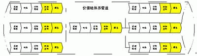 讀者知道,采用縱向一體化的企業(yè),必然會形成多個并行的不同的原材料的供應(yīng)過程,這必然引發(fā)向后一體化部分的擴充,它會形成一組提供各類原材料的供應(yīng)機構(gòu);同樣向前一體化部分的擴充,也會形成多個不同的銷售機構(gòu),那么此時的價值鏈體系將會被改造成這樣的體系(見下圖):
