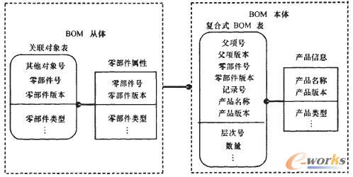 BOM作為描述產品結構與配置關系的表單,它主要由本體和從體兩部分組成。其中,BOM本體指零部件對象本身的結構關系,而BOM從體是指BOM主體的屬性集和與BOM主體相關聯的對象集兩部分。在關系數據庫中,其數據結構如圖3所示。