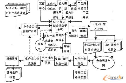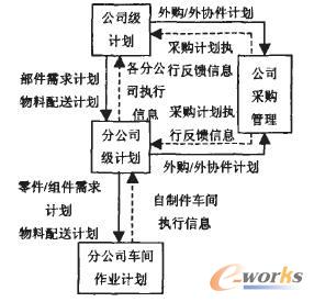 編制完公司級裝配主生產計劃后,各分公司繼續編制分公司的部件主生產計劃,各分公司在制訂自己的部件主生產計劃時。把公司級的物料需求計劃當成自己的訂單輸入,進行分公司物料需求計劃、細能力需求計劃與平衡、在制品出入庫管理、車間作業計劃編制,按公司級裝配物料需求計劃中對各分公司零部件加工最后完成時間點,倒排車間作業計劃,都是由后一道工序的開工時間來拉動前一道工序的完工時間,依此類推就可完成所有零部件的加工制造計劃和外購件、原輔材料的達到時間。公司、分公司計劃之間主要以訂單的形式確定出需要部件件號、需求時間、需求數量、配送計劃表等信息。