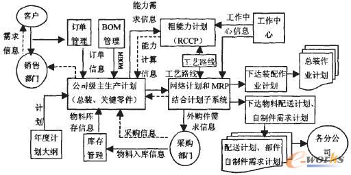公司級計劃主要包含了負責產品的銷售訂單獲取、產品設計、工藝/工裝設計、物資采購,總裝配主生產計劃、關鍵零件、關鍵工序能力平衡等技術準備計劃、生產準備計劃和生產計劃的編制、執行和考核,如圖2所示。