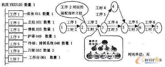 提前期:指某一工作的工作時間周期,即從工作開始到工作結束的時間。在ERP系統中,生產提前期是由制造工藝路線中每道工序傳送、排隊、準備、加工和等待時間構成的,生產制造階段的制造提前期由5類時間(排隊時間、準備時間、加工時間、等待時間、傳送時間)構成。總裝、部件采用以工藝路線為中心的物料清單,需要通過分析工序之間的關系得到粗工序網絡圖,如圖4所示,然后通過尋找關鍵路徑,并對關鍵路徑中的工序按照工作中心有限能力的計劃方法得到物料的提前期。