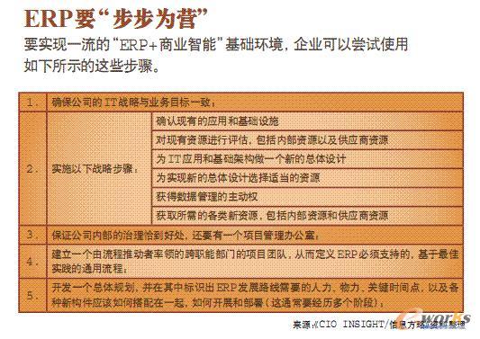 那么,實現一流的“ERP+商業智能”IT環境,究竟需要什么樣的路線圖呢?要回答這個問題,你首先必須明白,這個過程是意義非凡,并且充滿曲折的過程,甚至會向大航海般歷盡波濤起伏。它需要企業擁有高水準的管理水平,并作出堅實而持久的承諾。但有一點必須強調的是,路線圖所涉及的每一步戰略,必須是看得見摸得著而且可執行的,更重要的是它們必須是易采納的,因為它們將影響到企業的幾乎每個部門。