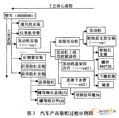 對汽車制造業來說,MBOM的關鍵是產品的物料間核心制造裝配。因此,從工藝文件中找到這些物料的核心制造裝配關系,就可以得到MBOM。這就是基于核心工藝流程構造 MBOM的核心思想。其關鍵在于如何表示產品工藝關鍵流程。
