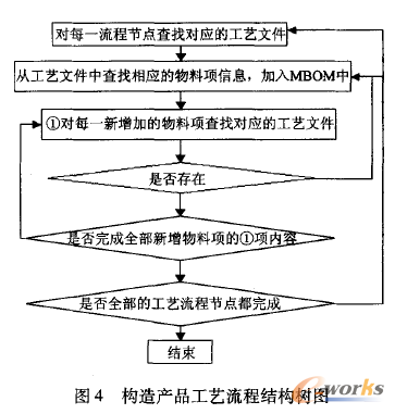 產品工藝流程節點對應著生產中某個或某些物料項。這是因為工藝流程節點的本質是一個或一組工藝過程,這個工藝過程必然要輸出物料項。為了制造這個輸出物料項,一定會有若干個輸人物料項,這些輸人物料項是上一個工藝流程節點的輸出物料項,或是初始狀態物料項。因此一個工藝流程節點必然對應著一個物料項。這樣就可以用相應的物料項去"替代"工藝流程結構樹中的流程節點,實現根據工藝流程節點所對應的工藝數據,一般指工藝規程。工藝規程中的信息表明了該工藝流程所要加工或制造商的物料項,而且其編碼是唯一的,可以作為MBOM的節點。如果是加工工藝規程,則指明了所需要的原材料或毛坯;如果是裝配工藝規程,則列舉了為裝配該物料項所需要的其他全部物料項以及相應數量。原則上材料、毛坯和子裝配件都作為該物料項的子節點出現在MBOM中。通過父子節點關系定義子節點的來源屬性和使用部門。這樣,根據工藝流程,結合工藝流程節點的、工藝信息,就可以構造出產品的MBOM,其核心算法如圖4所示。