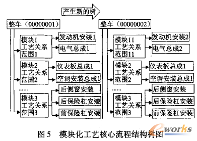 模塊化結合形成產品制造工藝結構樹,簡化工藝結構樹的管理,根據模塊間與整車的關系,利用參照樹的關系可以重新制造產品結構樹,實現精益物料與精益工藝的完美統一,如圖5所示。
