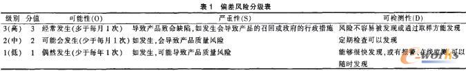 偏差等級的劃分是根據(jù)偏差發(fā)生的可能性、嚴(yán)重性、可檢測性綜合考慮的結(jié)果。可通過風(fēng)險優(yōu)先數(shù)來計算,風(fēng)險優(yōu)先數(shù)RPN=O×S×D,其中,0為風(fēng)險發(fā)生的可能性,S為風(fēng)險的嚴(yán)重性。D為風(fēng)險的可檢測性。