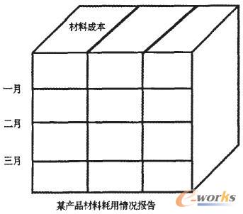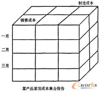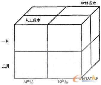 例如制造業的產品成本管理,如果只需要時期和成本項目兩維的數據,則兩維數據查詢可以通過平面表格表示(如表1所示);如果需要三維以上的查詢,則要用立體才可反映,如圖4所示。