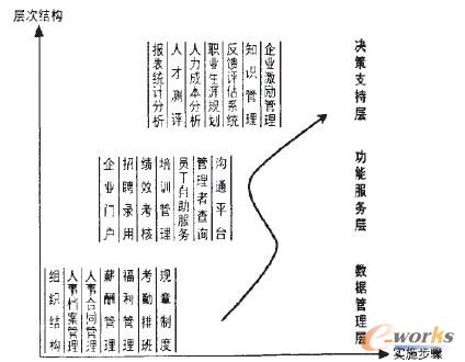 一套較完整的eHR系統(tǒng)功能及實(shí)施規(guī)劃(見(jiàn)圖1)。由圖1可以看出,eHR是一個(gè)循序漸進(jìn)但并不彼此孤立的過(guò)程。在eHR實(shí)施前期,企業(yè)應(yīng)該注重基礎(chǔ)平臺(tái)的搭建;隨著業(yè)務(wù)流程的不斷完善,再向更高的層次拓展。各層次可以同時(shí)使用,整體呈波浪式發(fā)展。隨著管理模式的不同,eHR也可以有不同的組合模式。