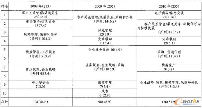 表3列舉了不同年份的前十大關鍵詞,不再對期刊進行區分。根據該表,可以對2008~2010年國際物流研究的熱點進行梳理。其中,“客戶關系/渠道關系”在前兩年中一直位居榜首,可見商品流通中各渠道成員關系始終是國際物流研究中的重中之重。“采購與外包”雖然在三年中的排位有所變化,卻一直處于榜單之中,這體現了全球化和社會大分工對于物流行業發展提出的巨大挑戰。此外,國際政治與社會議題也對物流研究有著深刻的影響。例如,隨著2009年底哥本哈根氣候大會的召開,“環境保護與可持續發展”議題在2010年躍升到第一位,成為焦點中的焦點,物流研究者們從自己所處領域對氣候變化問題及其對本領域的影響提出了各自的看法和解決方案。“客戶關系管理/渠道關系”、“采購與外包”、“績效管理”和“電子商務/信息交換”是2008~2010年持續的研究熱點,其中“客戶關系管理,渠道關系”和“績效管理”不僅僅只是供應鏈管理的熱點,也是整個管理學的熱點;其次,與“采購和貨運代理”這樣的經典議題不同,2008年和2009年頻發的自然災害和人為災難使得“災難救助”這個新的研究領域在之后的兩年里連續進入前10位的關鍵詞,也催生了“應急援助物流”這一物流業新議題,可見物流研究也在隨時追逐和貼近社會熱點;