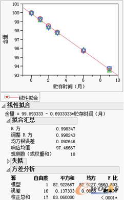 然后,針對所有數(shù)據(jù),用JMP軟件構(gòu)建出一個簡單線性回歸模型(如下圖所示),即含量= 99.893333 - 0.6933333*貯存時間(月)。從擬合匯總、方差分析的報表來看,該模型是成立的,具有顯著的統(tǒng)計學(xué)意義。這個模型的實際意義是:總體而言,每過1個月,藥品含量平均會下降0.69個百分比。
