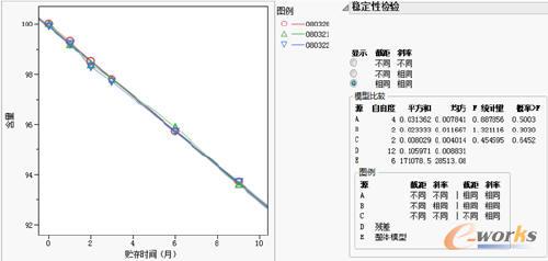 接著,想更加量化地研究藥品含量與存貯時間的關(guān)系。這時,回歸分析中的簡單線性回歸是個很合適的分析工具。我們可以為三個批號的藥品分別構(gòu)建一個回歸模型,也可以將這三個批號的藥品看作一個整體,只構(gòu)建一個單一的回歸模型。經(jīng)過用JMP軟件分析得到不同模型的比較檢驗(如下圖所示),發(fā)現(xiàn)可以用相同的截距和斜率來表達三個批號的藥品。因此,決定選擇第二種回歸分析方式。
