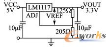 本設計采用了可調三端穩(wěn)壓器LM1117TADJ,可以將電壓進行線性轉換,電流為800mA,3引腳的TO200封裝。Cyclone系列FPGA上電的最大電流為300mA,該芯片可以滿足要求。LM1117需要在輸出與地之間接入電容以維持內部電路的穩(wěn)定,輸入與地之間也需要接入電容對輸入信號進行濾波[4]。具體的連接如圖3所示。