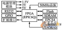 目前大部分Altera公司的FPGA均支持NiosII CPU,而Cyclone系列器件是當前世界上成本最低的FPGA芯片之一,因此本設計中的核心芯片采用Cyclone EP1C6,具有9800個邏輯單元,92Kb的RAM資源,提供兩個全功能的鎖相環(huán)(PLL)。I/O接口185個,還支持LVDS、DDR等傳輸接口。它的配置使用最新型的AS配置方式,配置芯片是EPCS4(Flash結構,4Mb)。