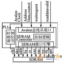在NiosII系統(tǒng)中,SDRAM主要用于存放運行程序和數(shù)據,并且其運行速度比Flash快很多。所以在SOPC系統(tǒng)中,當系統(tǒng)啟動后,NiosII CPU首先從復位地址0x0處讀取啟動代碼,在完成系統(tǒng)的初始化后,程序代碼一般應調入SDRAM中運行,以提高系統(tǒng)的運行速度。平臺使用的是hynix57V641620HGT,其存儲容量為4Bank×1M×16位(64 Mb)。SDRAM與總線的連接關系如圖5所示,其刷新頻率是靠FPGA內的PLL經過相移來提供。