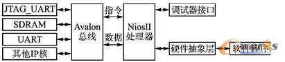 如圖7所示,采用NiosII單處理器,多個特定功能專用IP核的系統(tǒng)體系結構,軟件部分由處理器進行,而硬件部分功能由下載到FPGA上的IP核實現(xiàn)。硬件之間的通信以及與處理器的通信由Altera公司定義的Avalon片內總線實現(xiàn),而硬件和軟件之間的通信則是通過由IDE根據硬件系統(tǒng)生成的硬件抽象層HAL來實現(xiàn)的。
