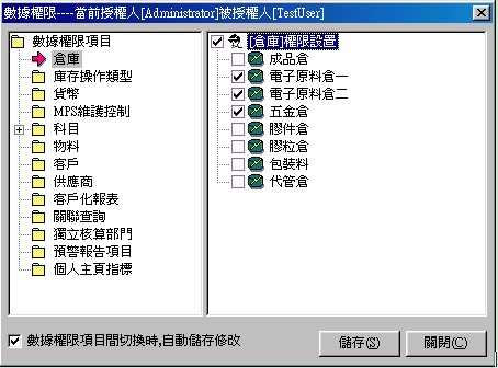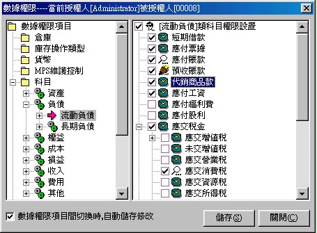 1. 在界面左邊的樹控件中選擇要進(jìn)行修改數(shù)據(jù)權(quán)限項(xiàng)﹐系統(tǒng)自動(dòng)在右邊的樹中刷新出數(shù)據(jù)權(quán)限項(xiàng)所對應(yīng)的所選操用員所擁有的有的數(shù)據(jù)權(quán)限。數(shù)據(jù)權(quán)限的授與各取消操作方式同菜單權(quán)限的操作方式一致。當(dāng)在數(shù)據(jù)類別之切換時(shí)﹐系統(tǒng)根據(jù)界面下部的選擇框的設(shè)定決定由系統(tǒng)自動(dòng)保存上一數(shù)據(jù)類別的修改還是提示用戶手工保存。