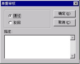 2. 審核:選擇一新單,然后點擊工具欄中的 或者菜單[業(yè)務(wù)\審核],系統(tǒng)彈出審核對話框。選擇‘通過’或‘駁回’,也可輸入批注,之后,按確定。