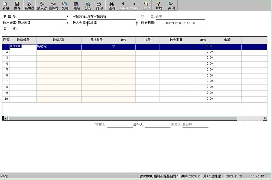 在操作上,轉倉要先錄入一張轉倉通知單,然后根據這張轉倉通知單,在相應的倉庫錄入出庫單、入庫單,完成物料的轉移。