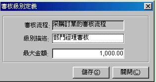 欄位 最大金額為必錄欄位﹐它設定的當前級別所能審核的單據的最大允許金額﹐超過此金額的單據就不適應當前的審核級別。系統系統將自動按最大允許金額從小到大的須序為所要求的單據選擇一個最適應的審核級別。所以在定義最大金額是﹐請注意同一個審核流程中的不同審核級別的最大金額定義。