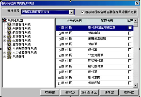 1. 點擊菜單[單據與審核流程關系維護],或工具條上的 按扭.系統顯示出如下視窗(圖4-4):