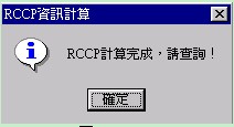 3.點“計算”按鈕在彈出的“RCCP資訊運算”視窗中,點“運算”按鈕,運算完成時出現以下圖3-3-5-1提示: