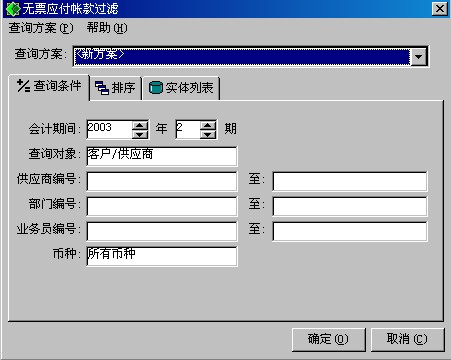 查詢方式有兩種:移至、查詢。查詢?nèi)鐖D5-13所示。界面上給出的查詢條件有會計期間、查詢對象、供貨商編號、部門編號、業(yè)務(wù)員編號、貨幣。系統(tǒng)默認(rèn)的查詢條件是當(dāng)前會計期間、所有供貨商、所有部門、所有業(yè)務(wù)員、以綜合本位幣反映的無票應(yīng)付賬款發(fā)生額及余額。您可以將系統(tǒng)給出的查詢條件根據(jù)需要任意組合,得到您要的查詢結(jié)果,請參見《公共操作手冊》’中的相關(guān)內(nèi)容。