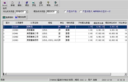 選擇要對比變化情況成本類型,選擇要模擬變化的成本類型,選擇一組成本要模擬變化的物料,并輸入其模擬成本變化值,點擊“模擬”按鈕系統(tǒng),系統(tǒng)將模擬變化的結(jié)果顯示出來。具體步驟如下: