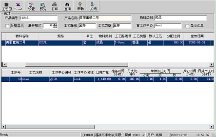 可以查詢產品本身及其下級物料的各類工藝路線的具體資訊。使用時在物料類別欄選擇不同的類別則可以查詢產品的子料中某一個類別屬性的子料的工藝路線。不選擇分層顯示時,則系統默認展開所有的層次的子料的工藝路線。如果選擇分層顯示時,可以輸入展開層次,則查詢時僅僅列出相應層次的子料的工藝路線。選擇工藝路線是否默認、工藝類型是“普通還是維修”則可以過濾顯示復合所選擇條件的工藝路線。選擇首工作中心則過濾出第一個工序的工作中心為此工作中心的工藝路線。如在“顯示匯總”前打勾則在一個視窗中顯示所有復合條件的工藝路線。