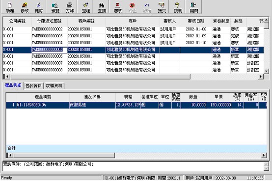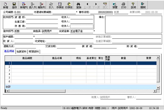 在此錄入付運的產(chǎn)品﹑單價﹑數(shù)量﹑金額等﹐必輸﹐可從訂單引入。 |