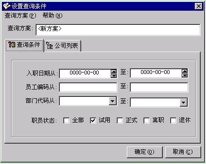 對(duì)試用合格的員工辦理轉(zhuǎn)正手續(xù)在此進(jìn)行。需辦理轉(zhuǎn)正的員工的資料來源是:?jiǎn)T工檔案中員工狀態(tài)為“試用”的員工。選取人事動(dòng)態(tài)模塊點(diǎn)擊菜單“員工轉(zhuǎn)正登記”,其查詢界面如圖4-1。確定或取消后其界面則如圖4-5所示。其功能如下: