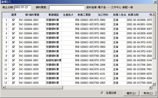 3. 點(diǎn)引入,系統(tǒng)顯示出對(duì)應(yīng)工作中心的符合條件的未完成領(lǐng)料單.如下圖: