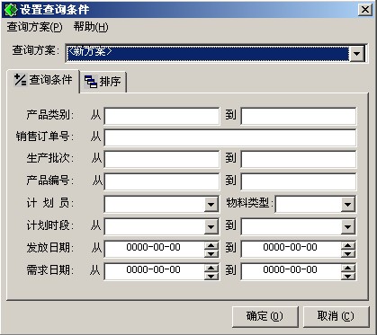 查詢方式有三種:定位、自定義查詢、查詢。查詢的查詢條件中列有:產品類別范圍、財務類別范圍、產品編號范圍、成組碼、物料類型、計劃員、查詢輔項、計劃時段。系統默認的查詢條件是當前日期之前的所有產品編號范圍的所有計劃結果。您能對接口上的條件進行任意組合。查詢接口見下圖對于自定義的查詢條件具體設定請參見《公共操作手冊》。