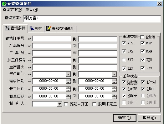 查詢方式有三種:定位、自定義查詢、查詢。查詢的查詢條件中列有:銷售訂單范圍、產品編號范圍、生產批次范圍、需求日期范圍、計劃員等。您能對介面上的條件進行任意組合。查詢介面如圖4-2-1。對于自定義的查詢條件具體設定請參見第四章附錄一“公共操作”。