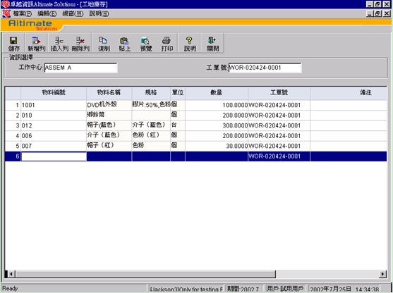 1、 從系統設定\生產初始化\工作中心庫存功能表欄進入:
