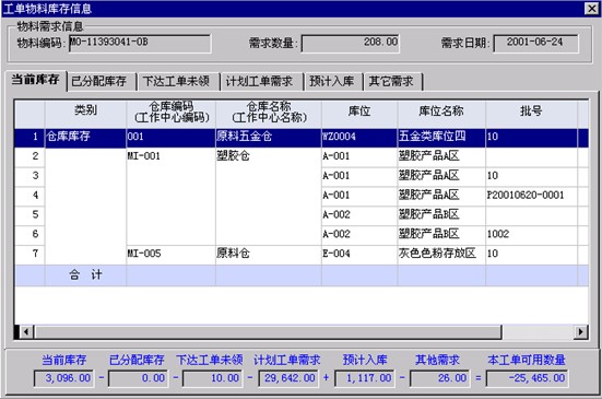 4、 點擊“庫存”按鈕,彈出工單物料庫存資訊視窗,如下圖3-19-5所示.。通過該視窗可以了解當前工單物料的庫存資訊、包括當前庫存數量,已分配庫存數量、下達工單未領數量,計劃工單需求數量, 預計入庫數量、其他需求數量等詳細資訊.