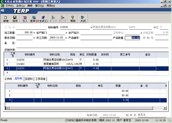 由于改制加工的工藝路線較為復雜,本系統中不能定義物料的改制工藝路線,所以要注意在工單錄入時正確錄入改制加工的工序資訊。