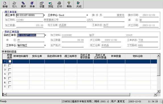 系統要求:轉接物料的數量和目的物料的已發料數量之和不能大于該物料在目的領料單的總需求數量。目的工單必須處于執行狀態,原工單也必須如此。目的工作中心和目的領料單上指明的領料工作中心不一定相同,即可能是目的單已經處于加工狀態,直接把料轉到后續的加工工作中心。