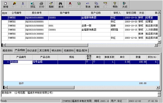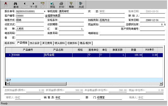 2. 在報價單錄入接口的表頭和”船務資料”,”產品明細”,”協議條款”,”其它費用”,”嘜頭資料”,”包裝資料”和”贈品\配件等頁面輸入相關的數據,點擊工具條上的”存儲”按鈕或檔案菜單上的”存儲”子菜單,就能生成一報價單。